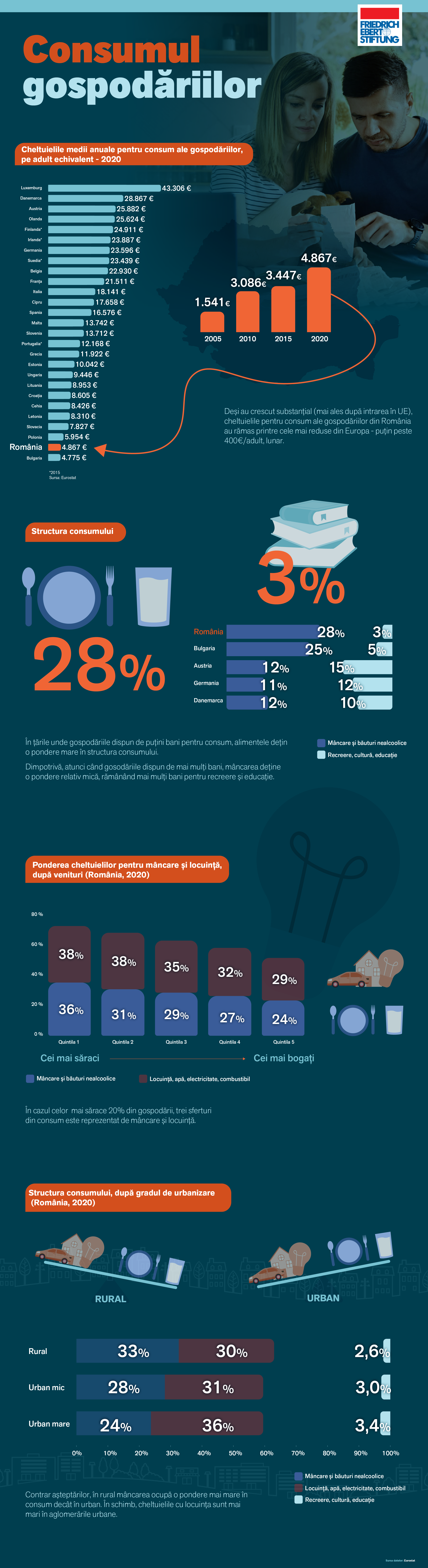 Deși au crescut substanțial (mai ales după intrarea în UE), cheltuielile pentru consum ale gospodăriilor din România au rămas printre cele mai reduse din Europa – puțin peste 400€/adult, lunar.