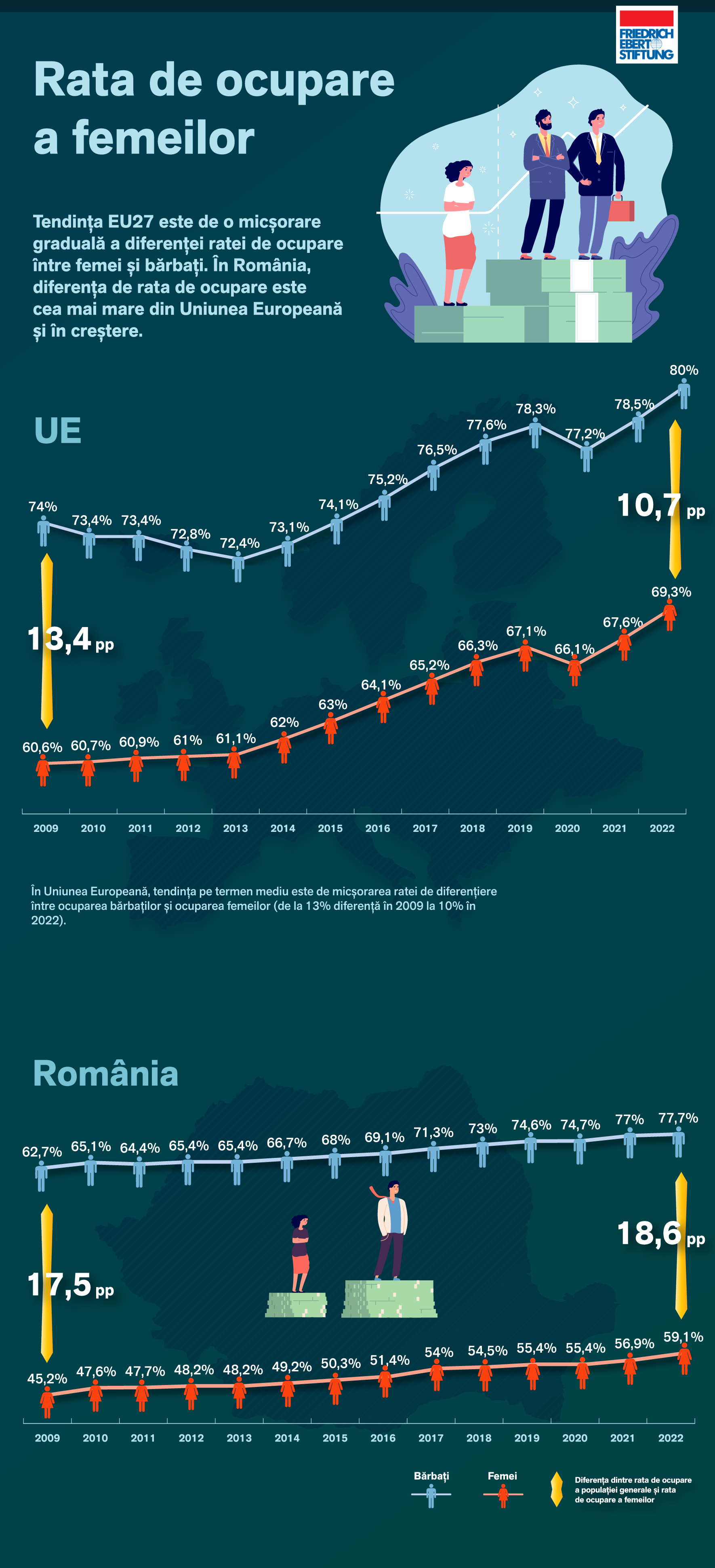 Rata de ocupare a bărbaților în Uniunea Europeană a crescut de la 74% în 2009 până la 80% în 2022, în timp ce rata de ocupare a femeilor din Uniunea Europeană a crescut de la 60,6% în 2009 până la 69,3% în 2022. Astfel, diferența între sexe în rata de ocupare a scăzut de la 13,4% în 2009 până la 10,7% în 2022 în statele UE27. În România, rata de ocupare a bărbaților în 2009 era de 62,4%, iar în 2022 de 77,7%; în schimb, rata de ocupare a femeilor în România era de 45.2% în 2009 și doar de 59.1% în 2022. Aceste cifre arată că diferența între sexe în rata de ocupare în România a crescut de la 17,2% în 2009 până la 18,6% în 2022, România fiind singurul stat din UE27 în care diferența de sex în rata de ocupare a crescut în acest interval de timp